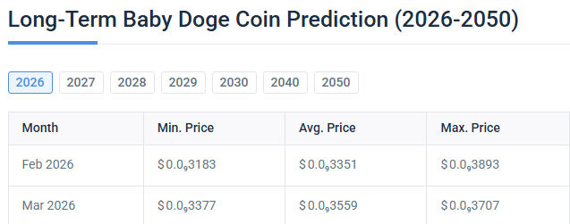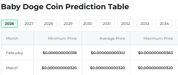 Price prediction models from third-party forecasting sites align with the cautious technical stance. Changelly’s projections for March 2026 suggest BabyDoge could trade at $0.00000000032 by next month, which marks the end of the first quarter. This indicates that Changelly expects the price of BabyDoge to slump by 17.94% from its current level of $0.00000000039.