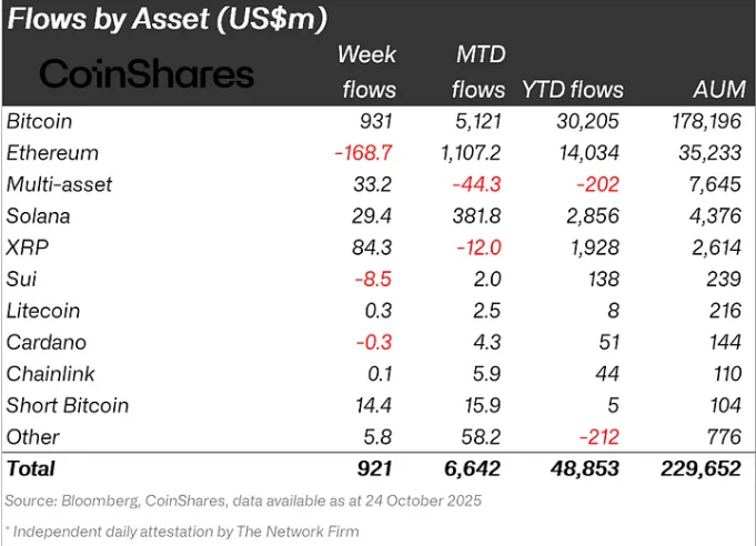 Crypto investment products witnessed a strong surge over the past week, with total net inflows reaching $921 million, according to CoinShares’ latest report for the week ending October 26, 2025. The report highlighted continued investor confidence in Bitcoin, which led with $931 million in inflows. In contrast, Ethereum recorded its first outflows in five weeks, totaling $168.7 million, signaling a shift in market sentiment.
