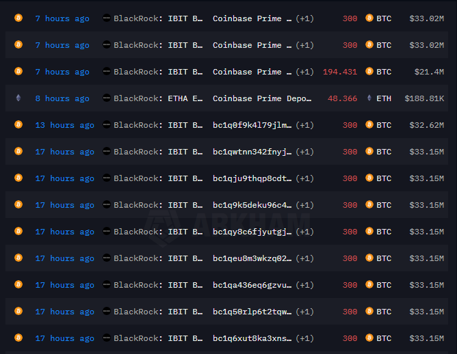 BlackRock has transferred several tranches of Bitcoin from its iShares Bitcoin Trust (IBIT) wallet over the past 24 hours, totaling 4,394 BTC worth about $471.15 million, according to data from Arkham Intelligence.