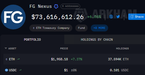 Ethereum treasury firm FG Nexus has sold 7,550 ETH worth $14.06 million, according to blockchain tracker Lookonchain. The on-chain sleuth disclosed the transaction in a recent X post, citing data from Arkham Intelligence, which showed the sale was executed in a single transaction.