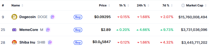 Recent data from asset tracker CoinMarketCap shows that MemeCore has overtaken Shiba Inu in the meme coin rankings, marking a significant milestone for the emerging project. The shift comes as MemeCore’s market cap surged to approximately $3.73 billion, surpassing Shiba Inu’s $3.44 billion valuation.