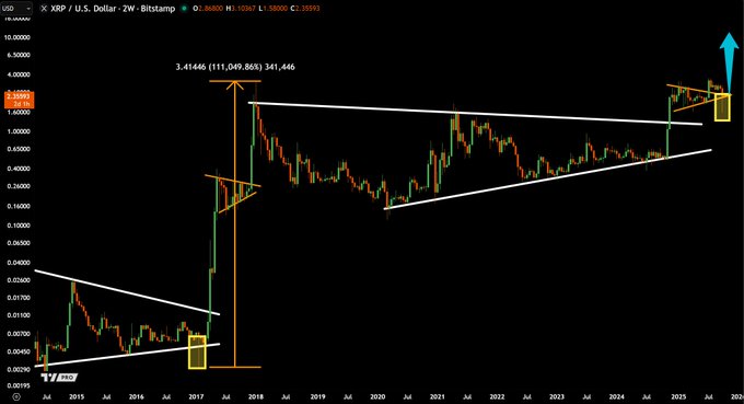 However, holding the lower support of the symmetrical triangle remains key in confirming a full breakout. If the candle closes above that level, it could signal a technical continuation pattern similar to the 2017 breakout phase that led to XRP’s historic run.
